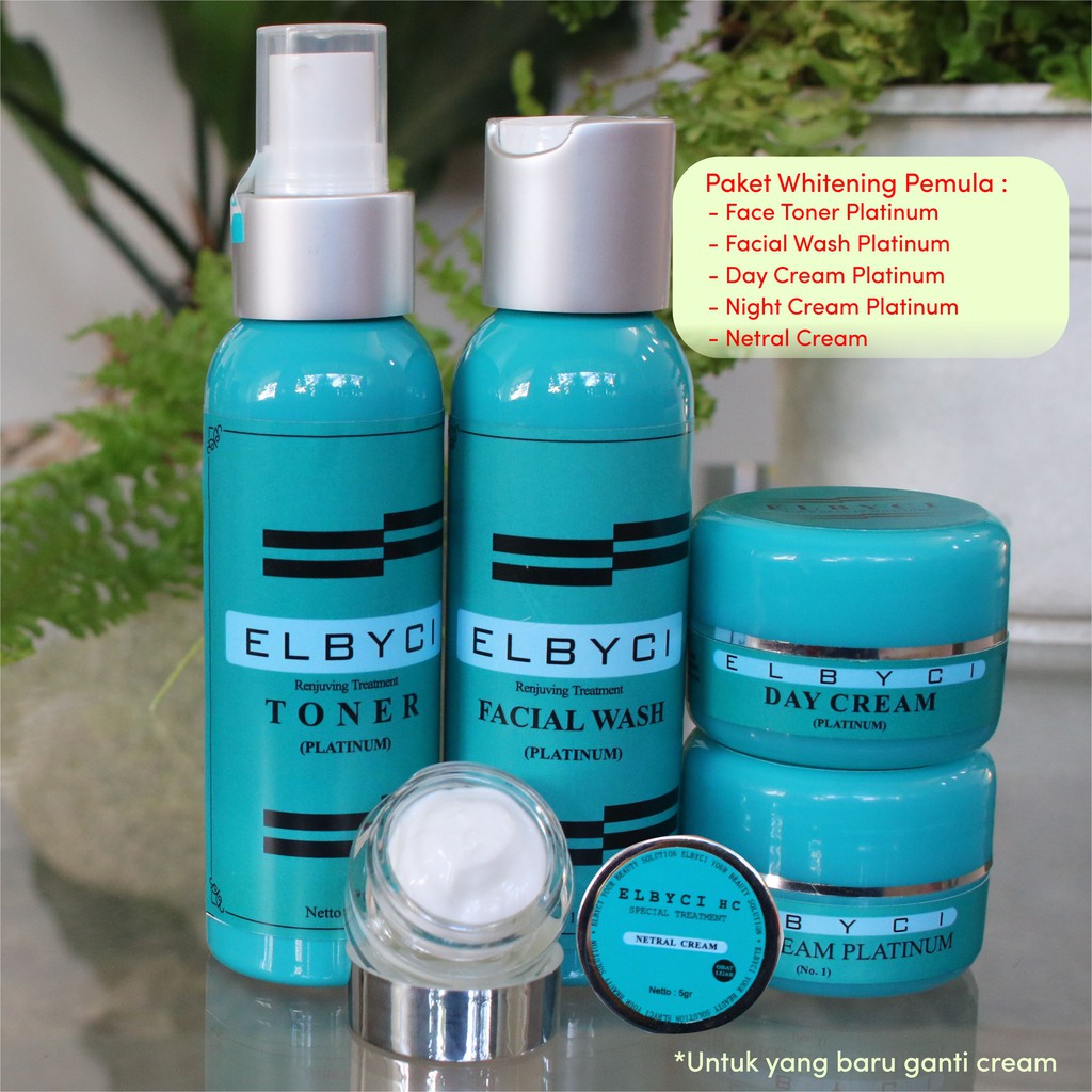Paket elbyci platinum perawatan wajah renjuving treatment pencerah wajah isi paket wajah. Facial wash 100ml toner 100ml. Night cream cream malam optimal elbyci. Elbyci paket platinum normal.