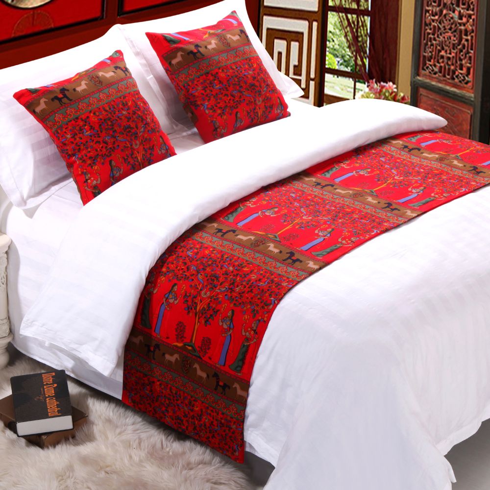 Satin Al Etnik Tarzi Kirmizi Polyester Yatak Ortusu Cift Katmanli